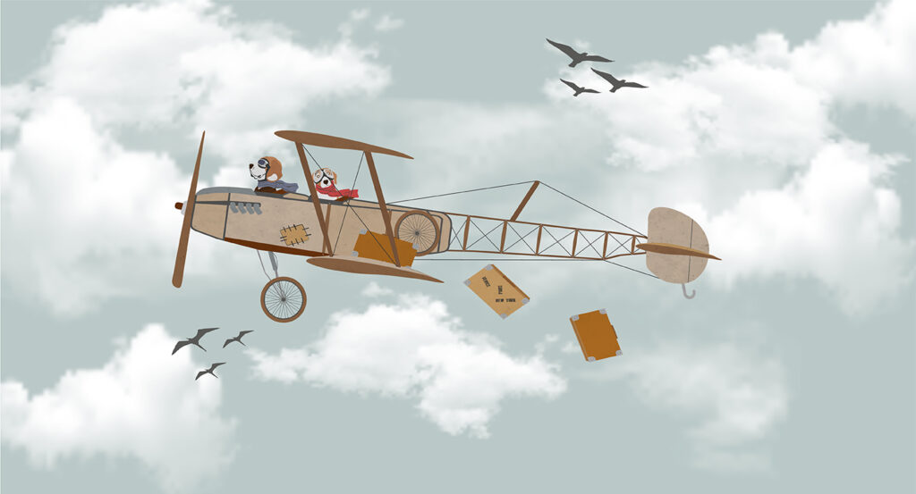 Az Álmodók gyerektapéta egy könnyed, égbe emelő kalandra hívja a kis felfedezőket. A vintage stílusú repülőgépben utazó kutyusok vidám és szerethető hangulatot teremtenek. A puha felhők és a madarak mozgása szabadságérzetet sugall. A meleg bézs és lágy kék árnyalatok harmonikus, nyugodt összképet alkotnak. A lebegő bőröndök izgalmas utazás ígéretét hordozzák. A részletgazdag illusztráció történetmesélésre és közös álmodozásra inspirál. Ideális választás minden kalandvágyó kisfiú és kislány szobájába. Nagy falfelületen igazán látványos, mégis légies marad. A design egyszerre játékos és elegáns, így modern enteriőrben is jól mutat. Az Álmodók tapéta a szabadság, a bátorság és a képzelet határtalan világát hozza el a gyerekszobába.