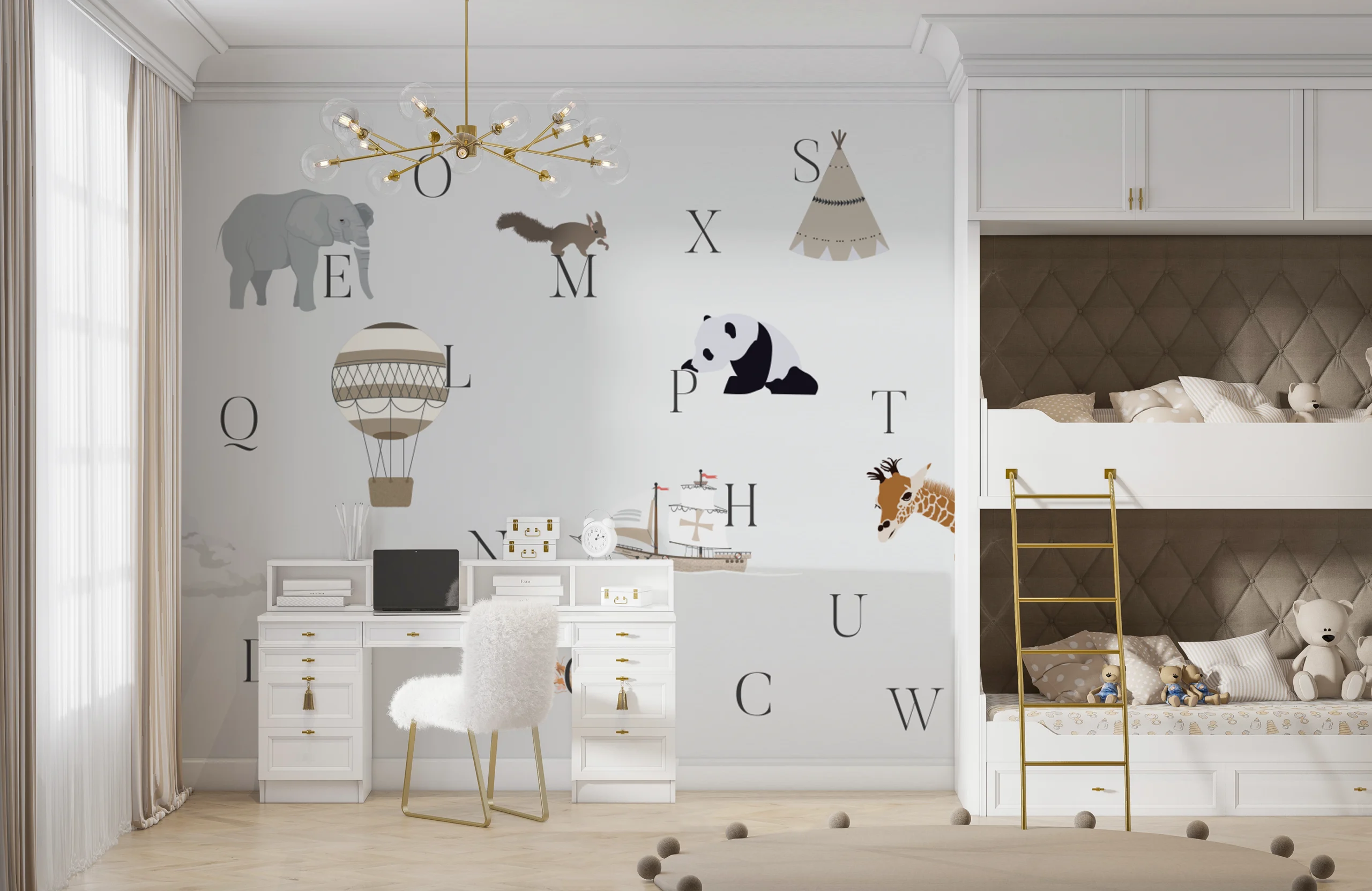 Az ABC gyerektapéta játékos formában vezeti be a gyerekeket a betűk világába. A betűk mellett kedves illusztrációk – állatok, járművek és mesés motívumok – segítik a tanulást és a vizuális kapcsolódást. A harmonikus, visszafogott színvilág nyugodt hátteret teremt a mindennapokhoz. A design egyszerre dekoratív és fejlesztő hatású, így ideális választás gyerekszobába vagy játszósarokba. A részletgazdag rajzok ösztönzik a beszélgetést és a történetmesélést. A betűk könnyen felismerhetők, így támogatják az ismerkedést az ábécével. A minta nem túl zsúfolt, mégis izgalmas felfedeznivalót kínál. Fiúk és lányok szobájába egyaránt jól illeszkedik. Modern és klasszikus enteriőrben is harmonikusan mutat. Az ABC tapéta egy szerethető, edukatív falikép, amely játékosan kíséri végig a gyerekeket a betűtanulás első lépésein.