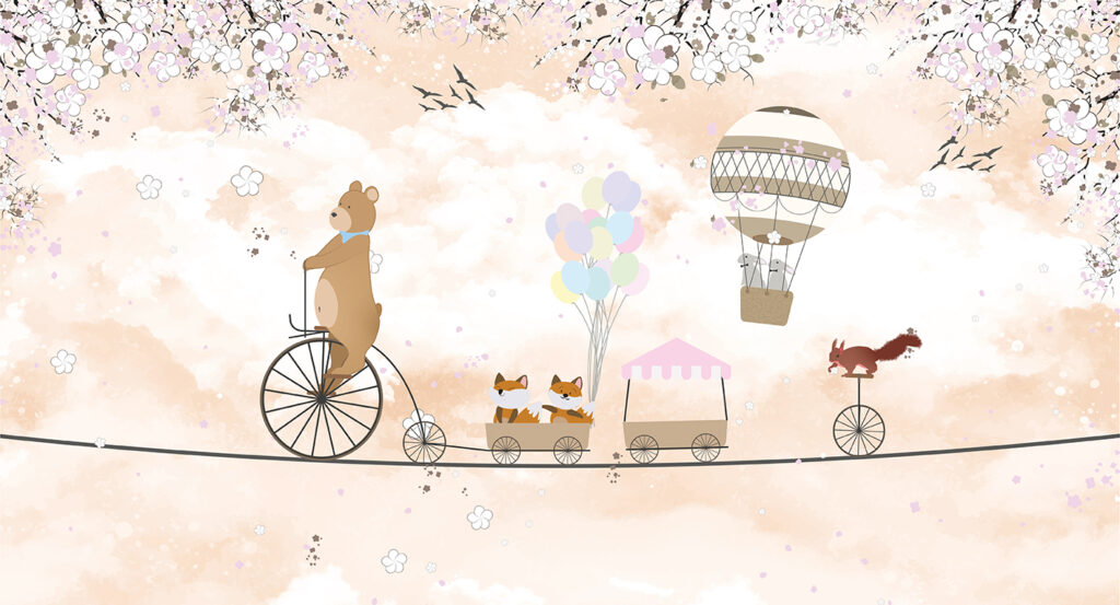 A Bicigli túra gyerektapéta egy bájos, mesebeli utazásra hív, ahol kedves állatok indulnak közös kalandra.