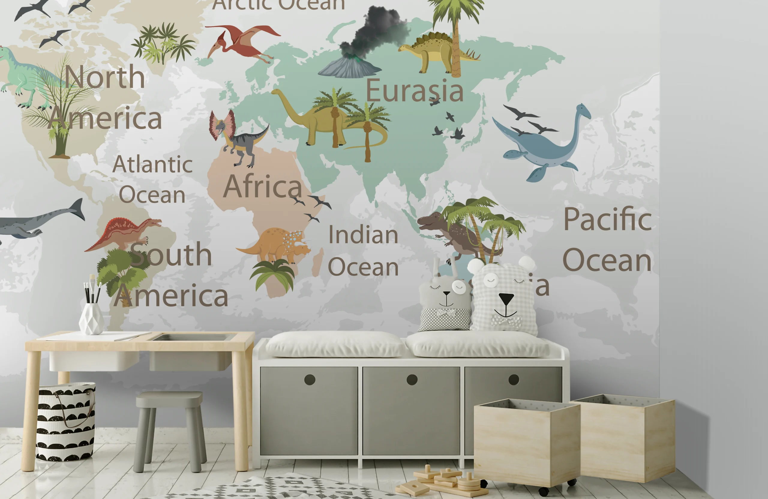 Ez a gyerektapéta izgalmas utazásra hívja a gyerekeket a dinoszauruszok és a földrészek világába. A térképes elrendezés játékosan mutatja be a kontinenseket és az óceánokat. Minden területen kedves, rajzolt dinoszauruszok jelennek meg, amelyek felfedezésre és tanulásra ösztönöznek. A visszafogott, természetes színek nyugodt hátteret biztosítanak a gyerekszobában. A design egyszerre dekoratív és edukatív, így tanulás közben is élményt nyújt. A részletek segítik a térbeli tájékozódás és az ismeretszerzés fejlődését. A minta nem túlzsúfolt, ezért hosszú távon is kellemes látványt nyújt. Ideális választás dinoszauruszrajongó gyerekek számára. Fiús és uniszex szobákba egyaránt jól illik. Ez a tapéta játékosan ötvözi a kalandot, a fantáziát és a tanulást.