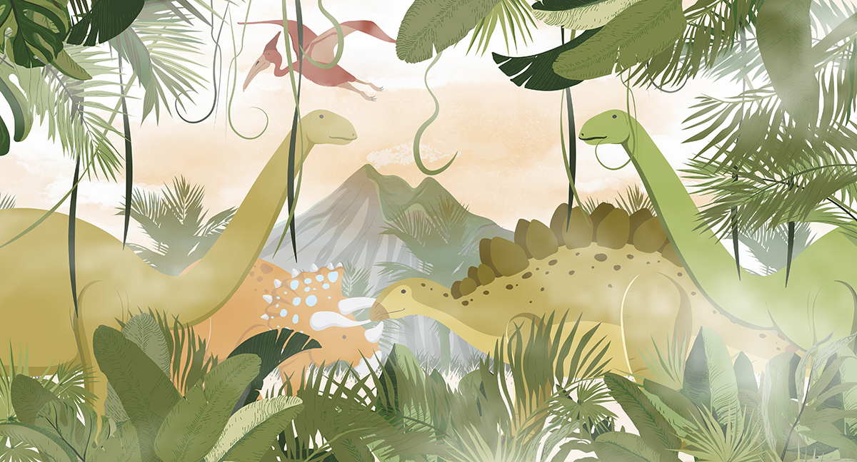 A Jurassic gyerektapéta egy izgalmas őskori világot varázsol a gyerekszoba falára. A hatalmas, barátságos dinoszauruszok a buja dzsungel mélyén elevenednek meg. A háttérben magasodó hegy és a repülő őshüllő még kalandosabbá teszi a jelenetet. A természetes zöld és földszínek harmonikus, mégis élénk összhatást biztosítanak. A részletgazdag növényzet igazi felfedezésre hívja a kíváncsi tekinteteket. A panorámaszerű kompozíció nagy falfelületen érvényesül igazán. A grafika egyszerre dinamikus és gyerekbarát, így nem válik ijesztővé. Ideális választás dinoszaurusz-rajongó kisfiúk számára. A minta játékos módon ösztönzi a képzeletet és a történetmesélést. A Jurassic tapéta egy bátor, kalandokkal teli őskori mesevilágot teremt minden nap.