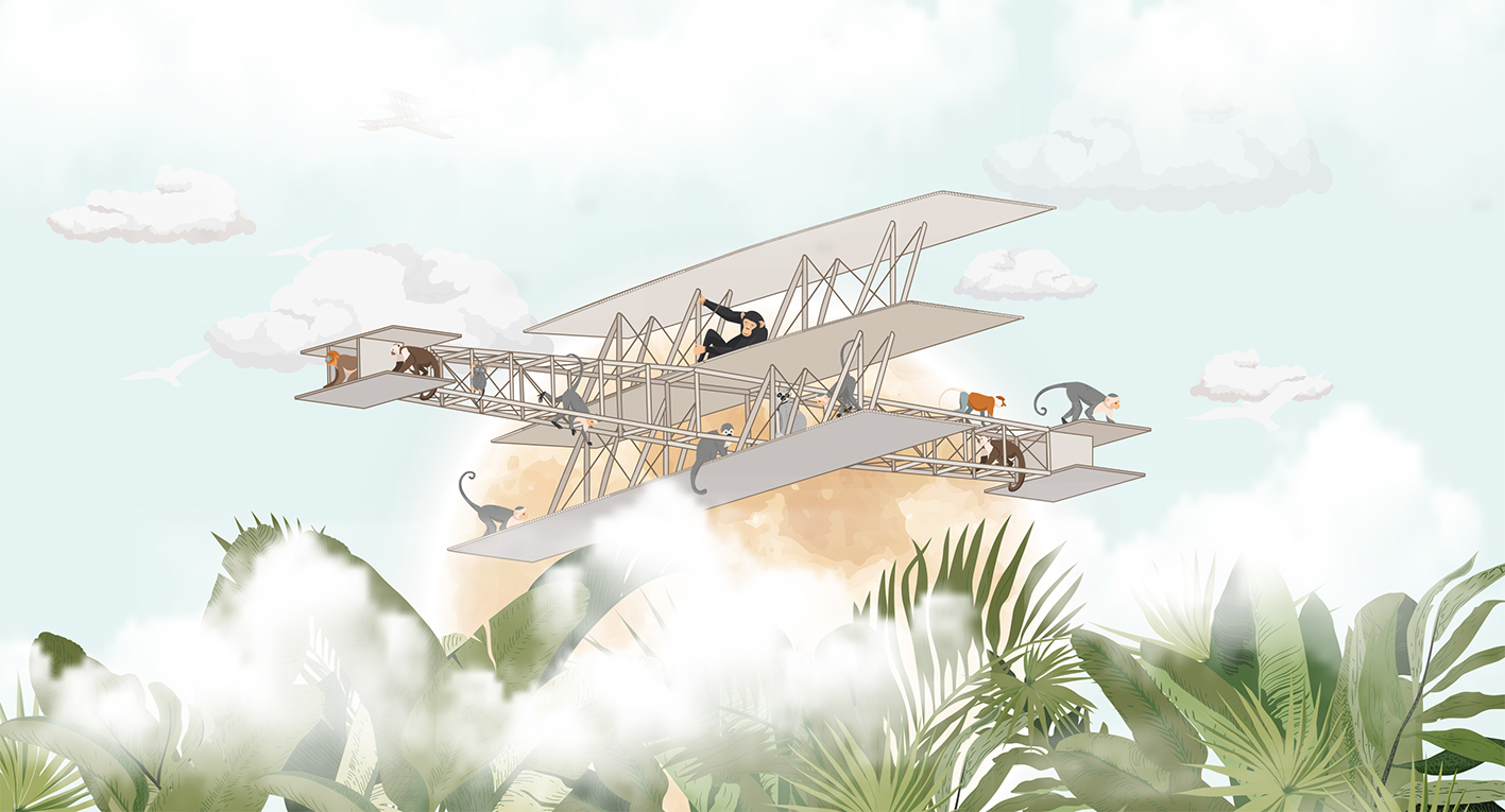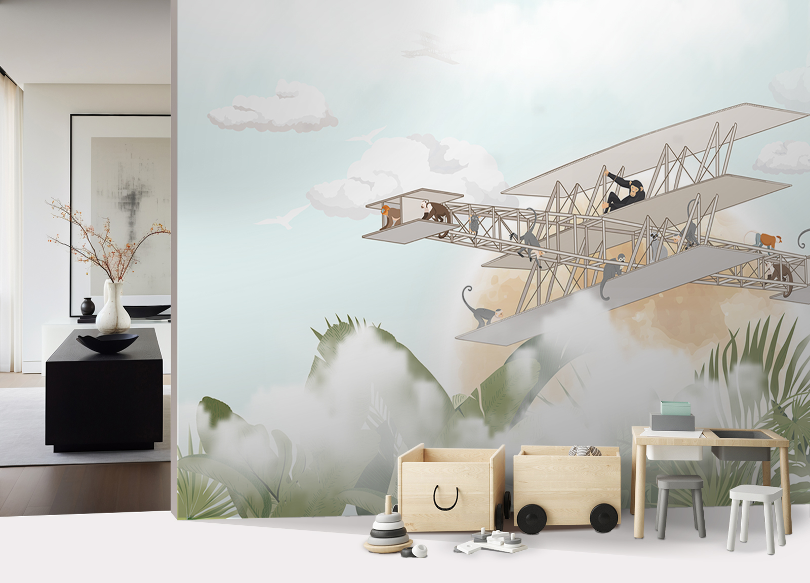 A Repülő majmok gyerektapéta egy izgalmas, mesés kalandra invitál, ahol játékos majmok szelik át az eget egy különleges repülő szerkezet fedélzetén. A felhők között lebegő jelenet az utazás és a felfedezés örömét idézi meg. A barátságos állatszereplők vidám, mégis nyugodt hangulatot teremtenek a gyerekszobában. A pasztelles színek és a finom illusztrációk harmonikusan illeszkednek bármilyen enteriőrbe. A dzsungel lombjai és az égbolt találkozása izgalmas, fantáziadús környezetet alkot. Ez a tapéta ösztönzi a képzelőerőt és történetmesélésre inspirálja a gyerekeket. Ideális választás kalandvágyó kisfiúk és kislányok szobájába egyaránt. A részletgazdag grafika hosszú időn át leköti a figyelmet. A Repülő majmok design egyszerre játékos és megnyugtató. Tökéletes háttér a mindennapi játékhoz, álmodozáshoz és pihenéshez.