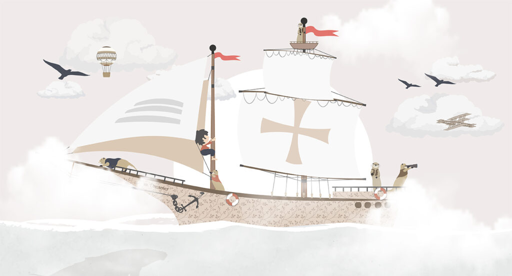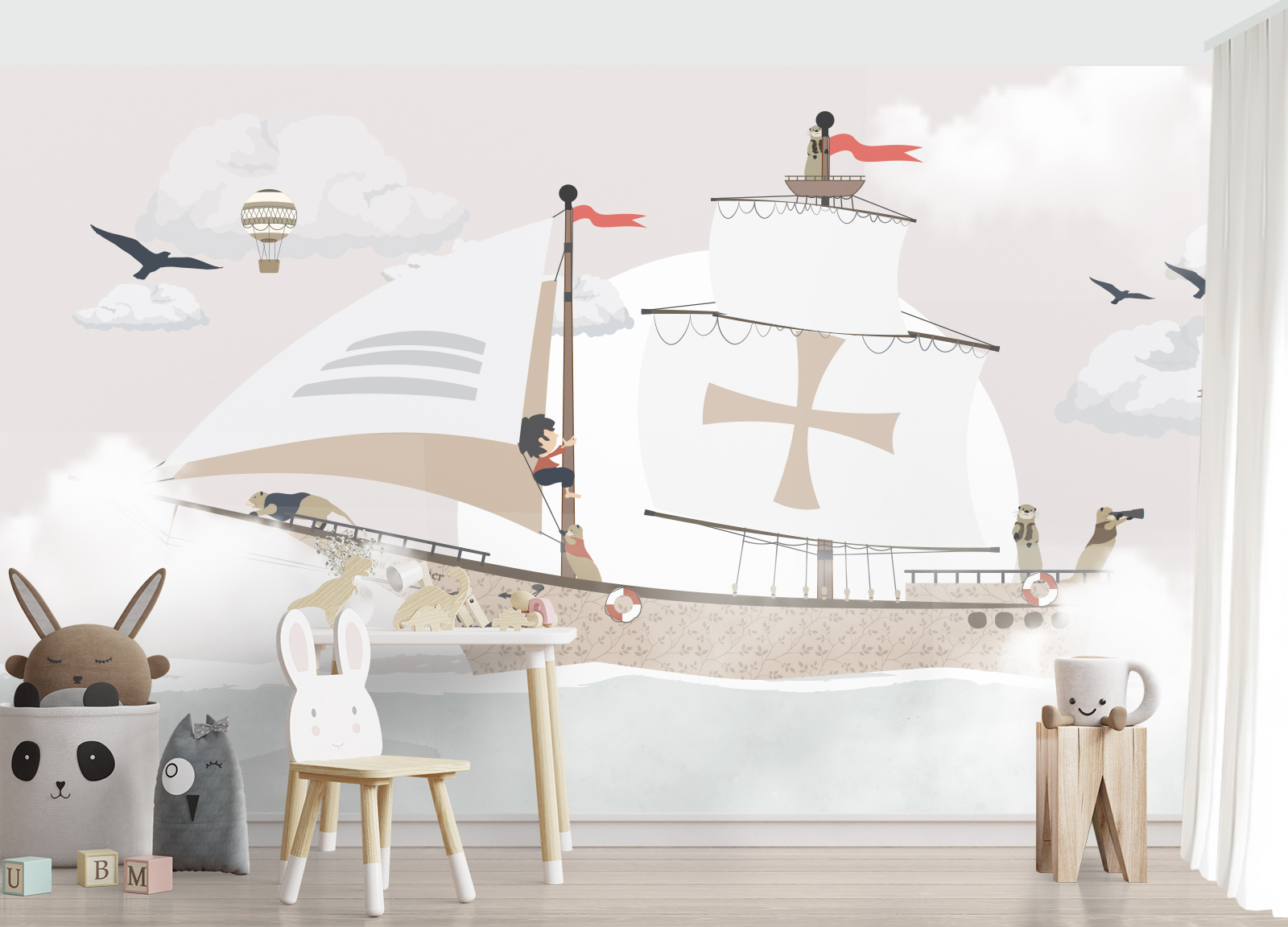 Ez a gyerektapéta izgalmas tengeri kalandra hívja a kicsiket egy mesés vitorláshajó fedélzetén. A nyugodt, pasztell árnyalatok harmonikus és kiegyensúlyozott hangulatot teremtenek a gyerekszobában. A hajón dolgozó kedves kis tengerészek játékosan mutatják be a felfedezés örömét. A felhők között úszó léghajó és a távolban repülő madarak tovább fokozzák az álomszerű atmoszférát. A részletgazdag illusztrációk megmozgatják a gyerekek fantáziáját és történetmesélésre inspirálnak. A design egyszerre kalandos és megnyugtató, így nappali játékhoz és esti pihenéshez is ideális. A visszafogott színvilág hosszú távon sem válik fárasztóvá. Fiús és uniszex gyerekszobákba egyaránt jól illik. Könnyen kombinálható natúr, skandináv vagy vintage stílusú bútorokkal. Ez a tapéta tökéletes választás minden kis felfedező számára, aki szereti a tengert és a kalandokat.